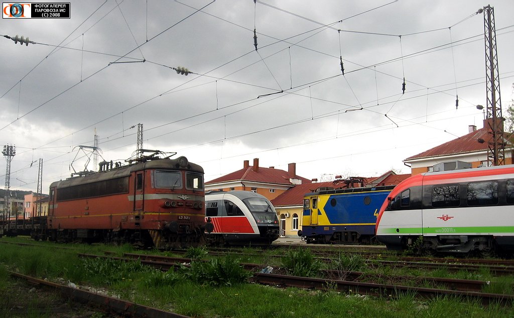 | Встреча поколений. Электровоз 42-141 (произв. "Шкода", модернизация: Болгария) с грузовым поездом № 50602 встретился с дизель-поездом и электропоездом "Сименс" и электровозом 46-238. Станция Перник, Болгария Автор: Александр Ковачев | Фото сделано 18.IV.2008, опубликовано 19.IV.2008.