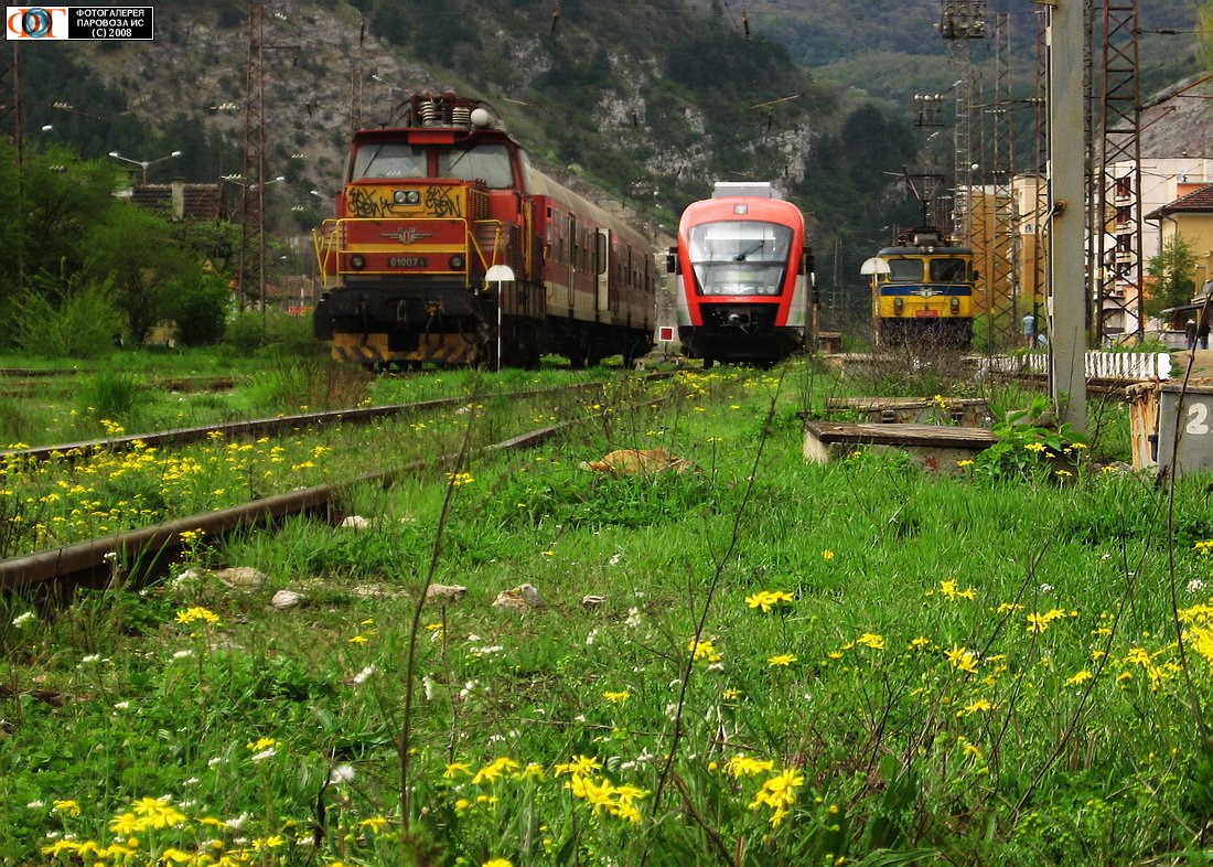 | На Пернишком вокзале. Электровоз 61-007 с пассажирским поездом № 60204 Перник - Храбрско. Электропоезд "Siemens Desiro" 30-011/012 с пассажирским поездом № 50206 Перник - София. Электровоз 46-238 (на втором пути), Болгария Автор: Александр Ковачев | Фото сделано 18.IV.2008, опубликовано 19.IV.2008.