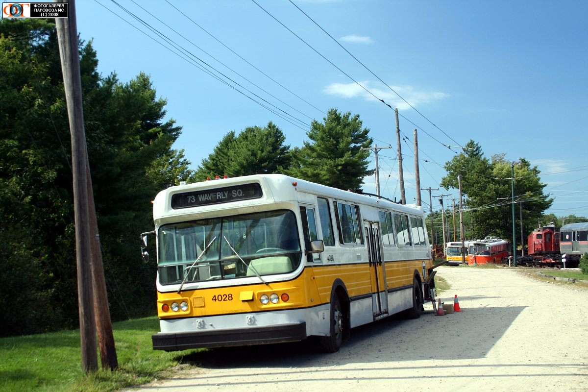 Совсем недавно списанный бостонский троллейбус № 4028 ("Флайер", он же неформально "Аквариум", 1976 год), Прибрежный трамвайный музей, Кеннебанкпорт