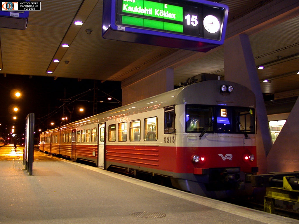| Электропоезд Sm1 №6215/6015 маршрута Е Хельсинки - Кауклахти на 15 пути вокзала в Хельсинки, Финляндия Автор: Станислав Воронин | Фото сделано 28.X.2008, опубликовано 9.XI.2008.