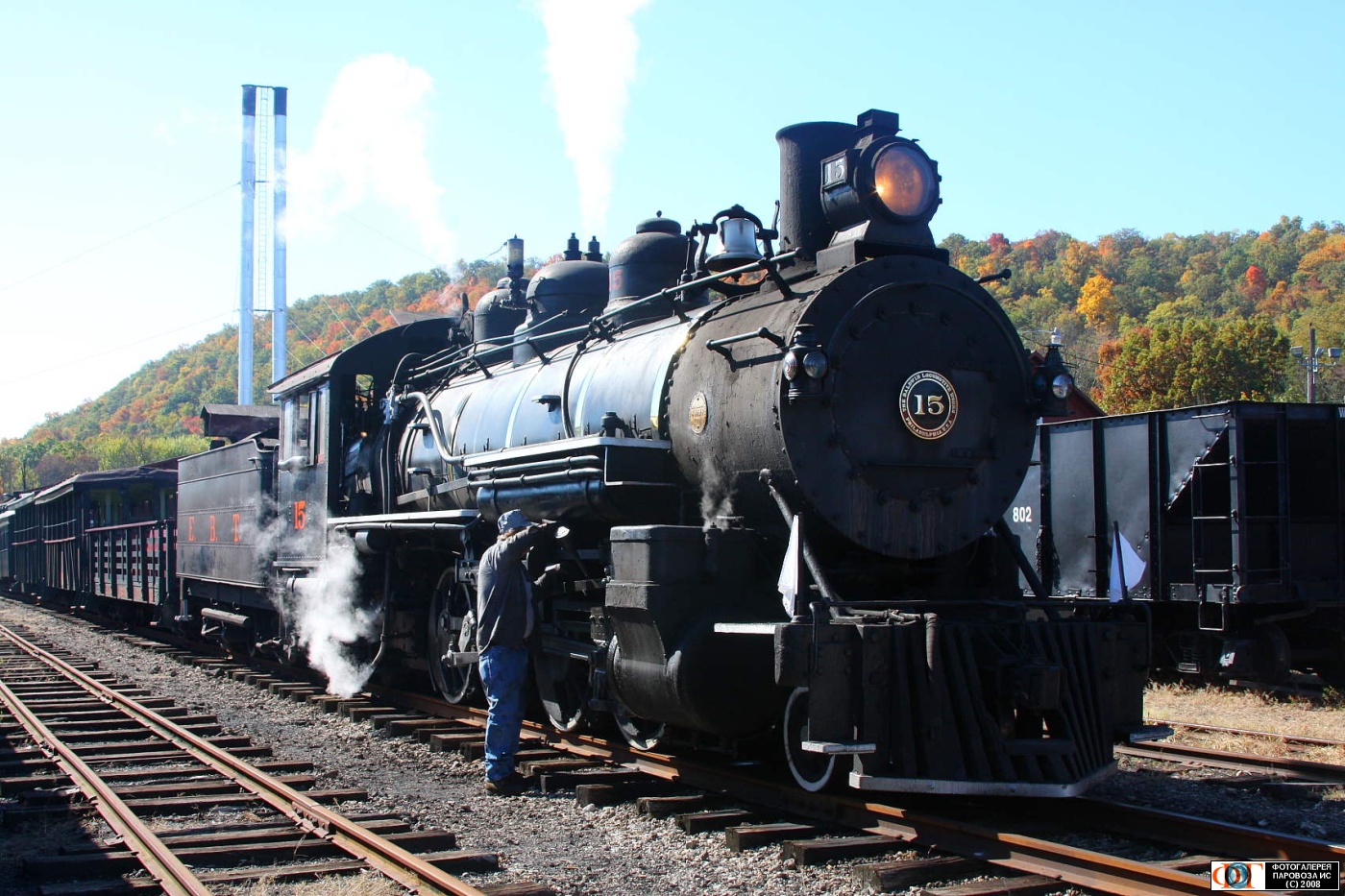 | "Будни паровозной бригады". Узкоколейный паровоз М36"-15 типа 1-4-1 компании "Е.В.Т." 1914 года, Орбизония, США/Пенсильвания Автор: Александр Белоусов | Фото сделано 12.X.2008, опубликовано 4.XII.2008.