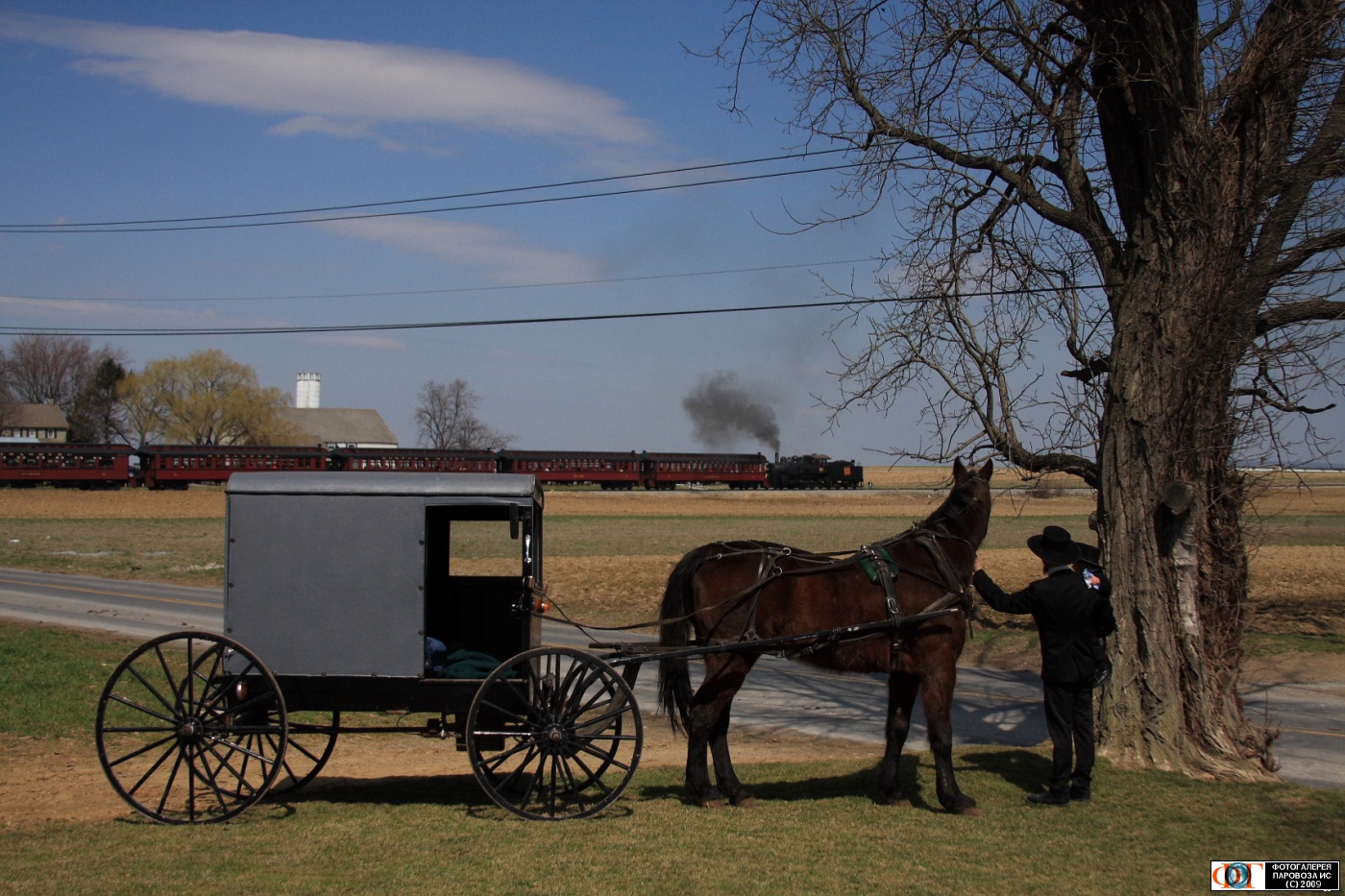 2. Староверы амиши не дают себя фотографировать (отворачиваются, закрывают лицо руками, ездят в таких закрытых каретах). Пришлось пойти на хитрость: я стоял на уровне кареты "фотографируя", увидев как все (включая лошадь) увлечённо наблюдают за паровозом - отскочил назад и сделал серию снимков. А кареты у них "упакованные": зеркала заднего вида, поротники, ручной тормоз. -- Александр Белоусов , 05:42