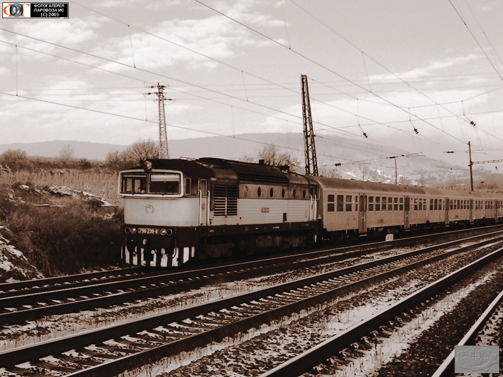 | Tепловоз 750.238-8 с пассажирским поездом. Братислава-Винограды, Словакия Автор: zoric | Фото сделано 16.I.2009, опубликовано 28.V.2009.