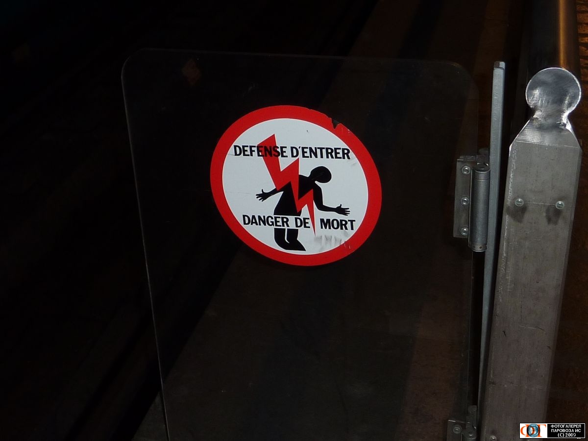 | Предупреждающая наклейка на ограждении перед тоннелем. Станция метро "Гар Пар-Дё" (Gare Part-Dieu), Лион, Франция Автор: Александр ТЧ-15 | Фото сделано 11.XII.2009, опубликовано 27.XII.2009.