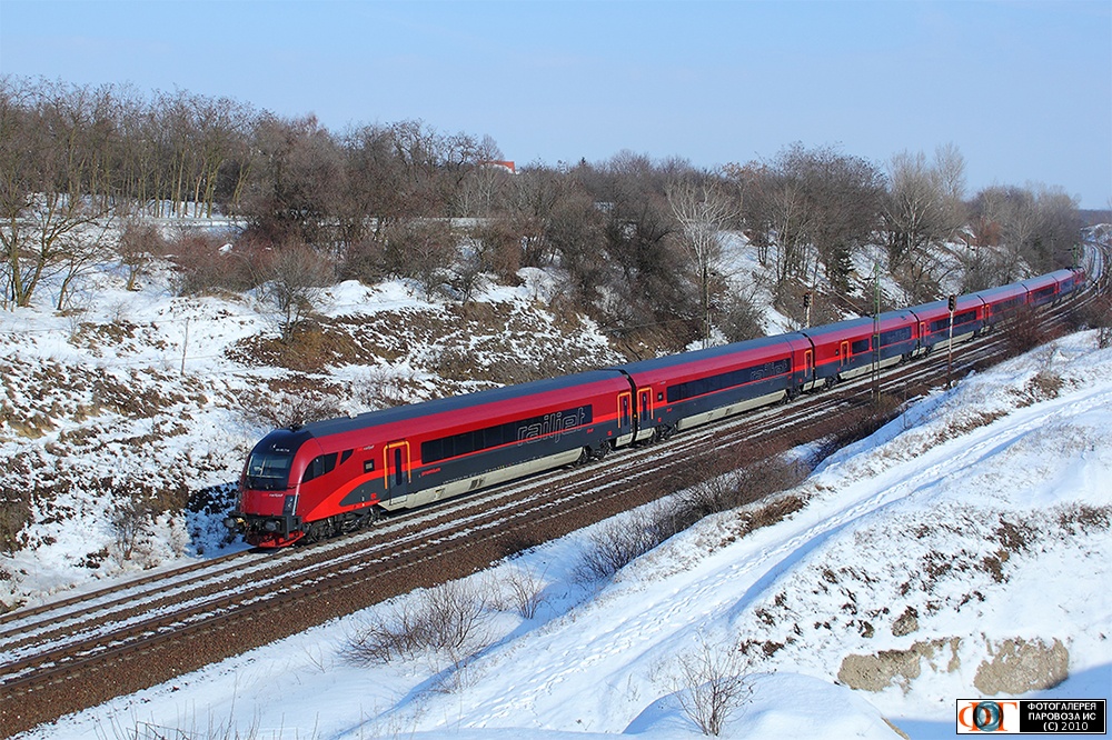 | Пассажирский поезд "Рейлджет" (Railjet) c головным вагоном управления 80-90.716 Австрийских ж.д. у ст. Сар (Szár), Венгрия Автор: Elek Máté | Фото сделано 14.II.2010, опубликовано 23.V.2010.