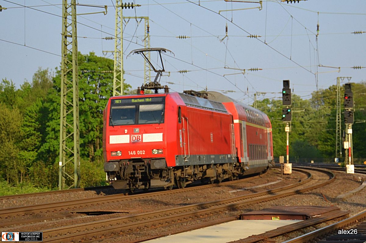 | Электровоз 146.002 с региональным экспрессом (RE1), станция Дюссельдорф-Фольксгартен, Germany/North Rhine-Westphalia Author: Алекс | Picture taken: 19.IV.2011, published 28.XII.2011.