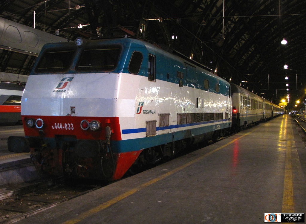 | Электровоз итальянской ж.д. компании FS E444R-033 между рейсами на вокзале Милан-Центральный, Италия Автор: Женя | Фото сделано 17.XII.2011, опубликовано 11.VII.2012.