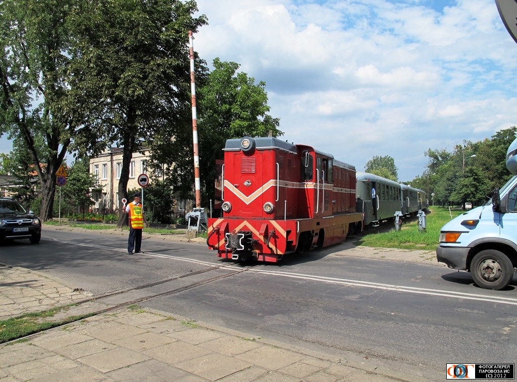| Тепловоз Lyd2-342 с пассажирским поездом пересекает переезд перед вьездными воротами в музей УЖД, Сохачев, Польша Автор: ВИКТОР | Фото сделано 9.VIII.2012, опубликовано 4.IX.2012.