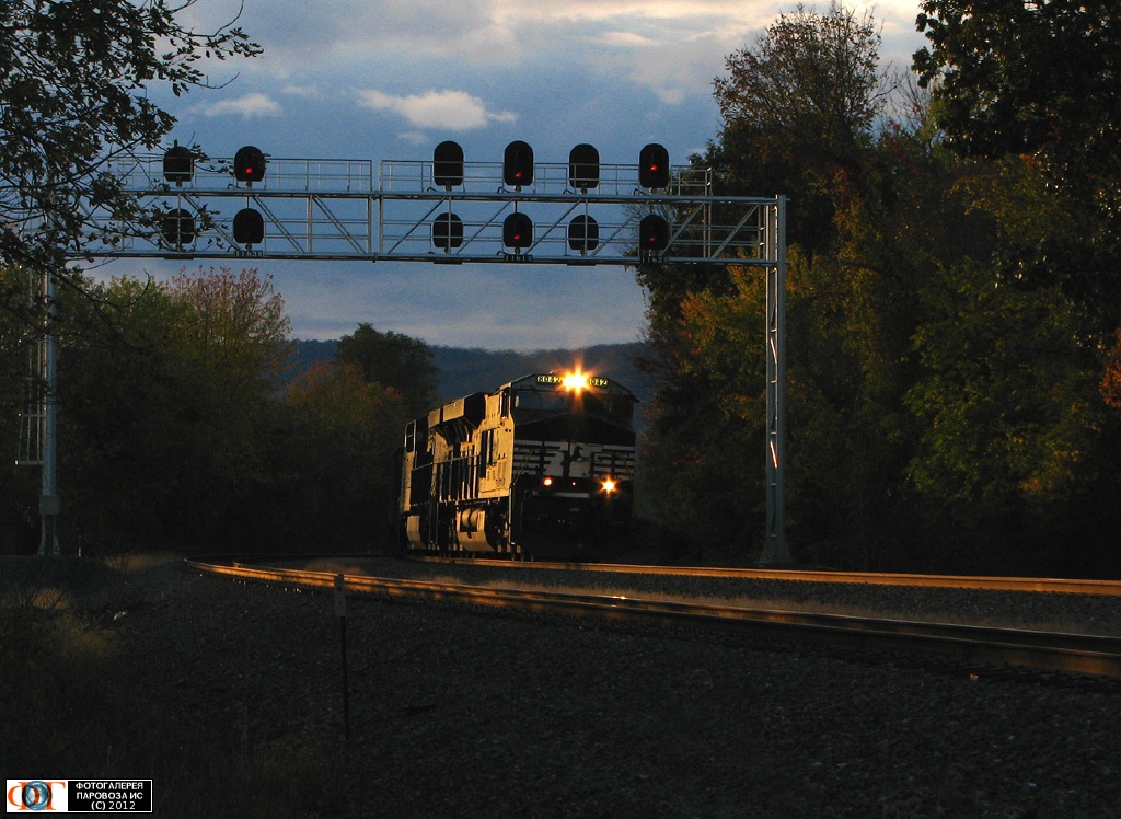 | "Тяжёлый вираж". Тепловоз компании "Норфолк-Саузерн" ES44AC-8042 проходит светофоры в посёлке Ков с составом груженных уголных хопперов на главном ходе линии Питтсбург - Гаррисбург - Филадельфия, США/Пенсильвания Автор: Женя | Фото сделано 20.X.2012, опубликовано 29.X.2012.
