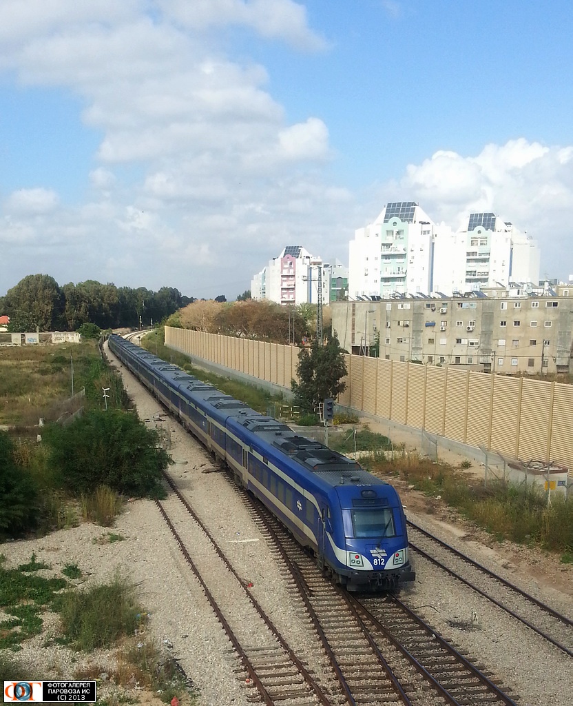 | Поезд "Сименс Виаджио Лайт" с головным вагоном №812 сообщением Модиин - Нагария проходит горловину ст. Хадера-Западная, Израиль Автор: Илья БКН | Фото сделано 16.IV.2013, опубликовано 3.V.2013.