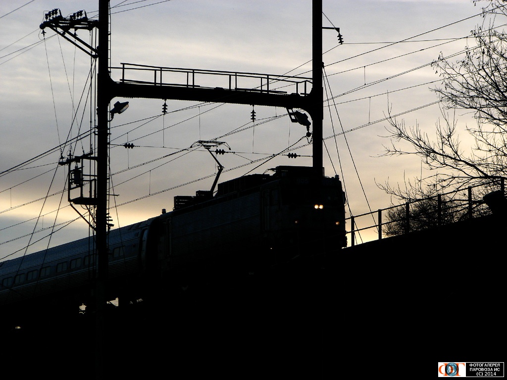 | Электровоз компании "Амтрак" АЕМ7-905 въезжает на мост через р. Сускуаханна с поездом №158 Вашингтон - Нью-Йорк на фоне захода солнце. Хавр-де-Грэйс