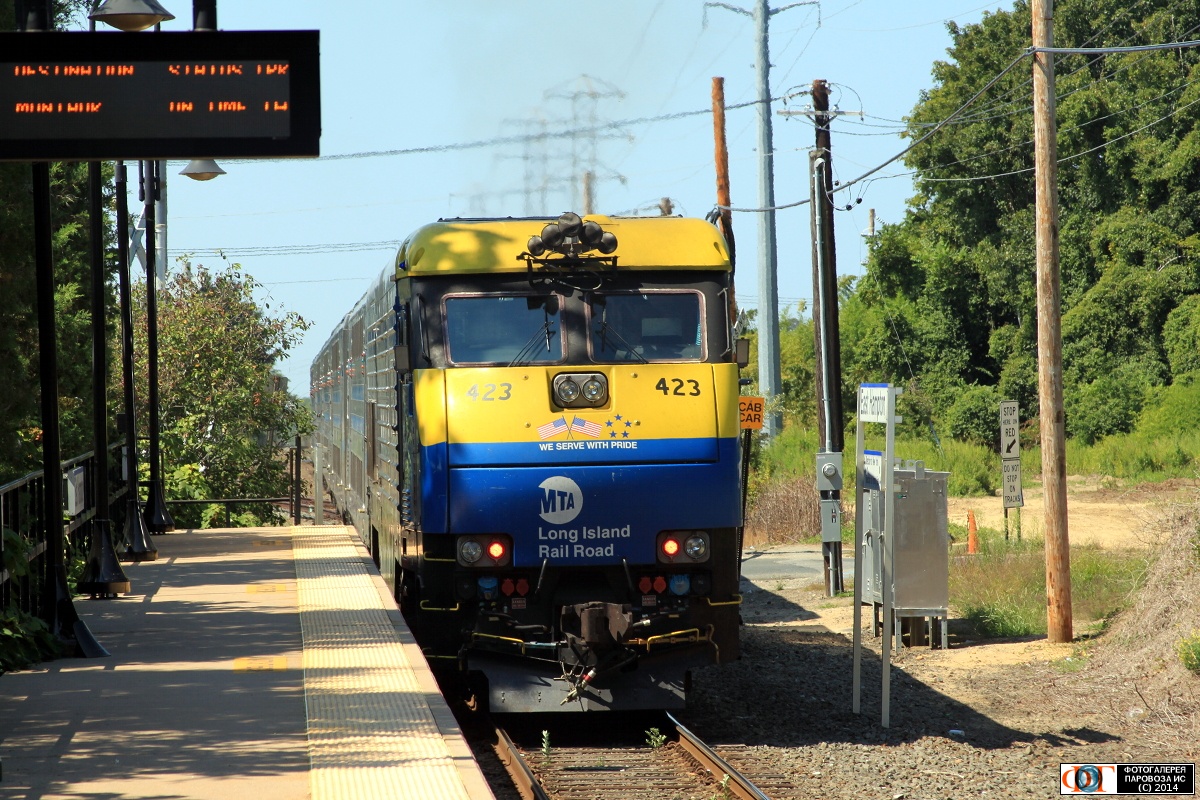 | Тепловоз-электровоз DE30AC-423 Лонг-Айлендской ж.д. отправился с разъезда Ист-Гемптон с пригородным поездом Монток - Джамайка, США/Нью-Йорк Автор: Зиновьев Д. | Фото сделано 25.VIII.2014, опубликовано 5.IX.2014.