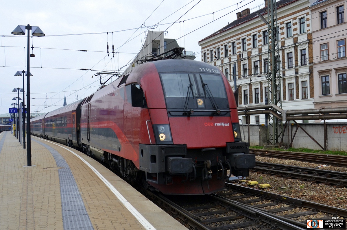 | Электровоз 1116-206 с поездом "РайлДжет", Западный вокзал Вены, Австрия Автор: Алекс | Фото сделано 7.IV.2012, опубликовано 21.II.2015.