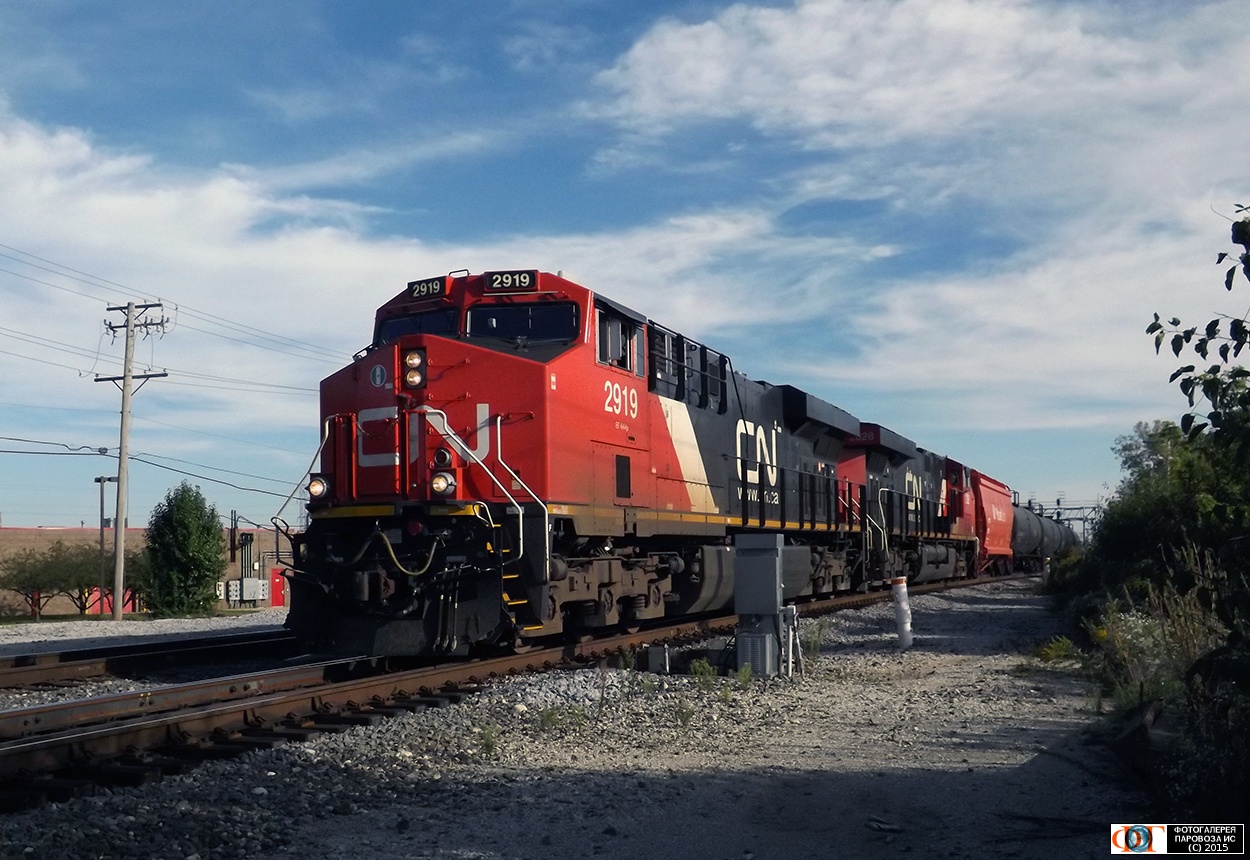 | Тепловоз ES44AC-2919 компании CN с грузовым поездом проходит блок-пост Лейгтон (Leighton). Линии WC и EJE. Манделейн, США/Иллинойс Автор: Роман | Фото сделано 23.IX.2015, опубликовано 25.IX.2015.