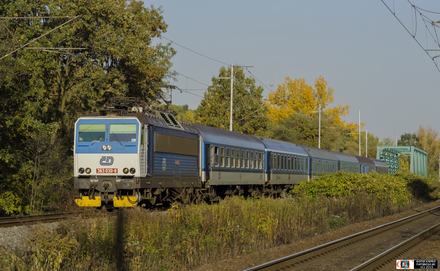 | Электровоз 363.030-8 с пассажирским поездом R830 на перегоне Острава-Главный вокзал - Острава-Свинов, Чехия Автор: ES499 | Фото сделано 24.X.2015, опубликовано 9.I.2016.