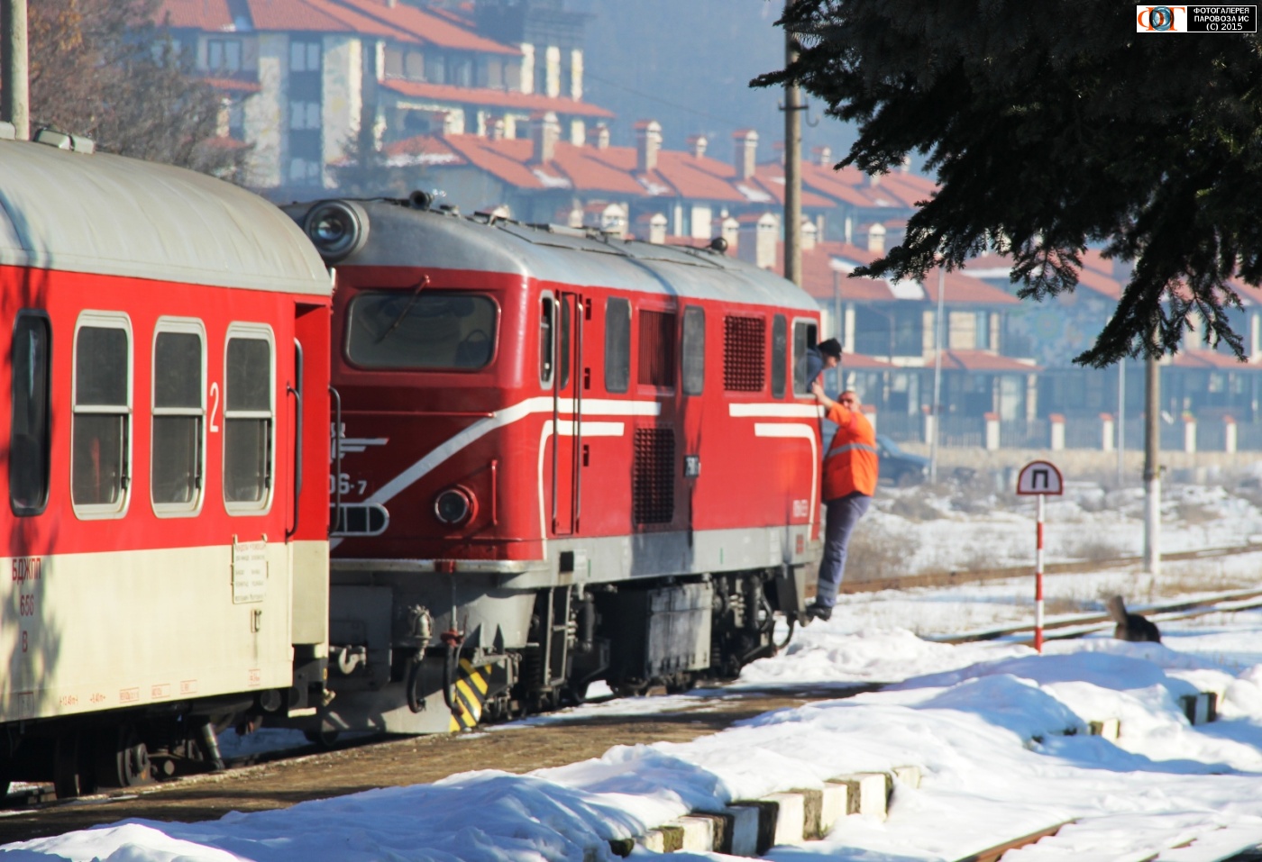 | Тепловоз 75006-7 производит маневровую работу на станции Добриниште узкоколейной ж.д. линии Септември - Добриниште, Болгария Автор: Геннадий теплоходов | Фото сделано 28.I.2016, опубликовано 2.II.2016.