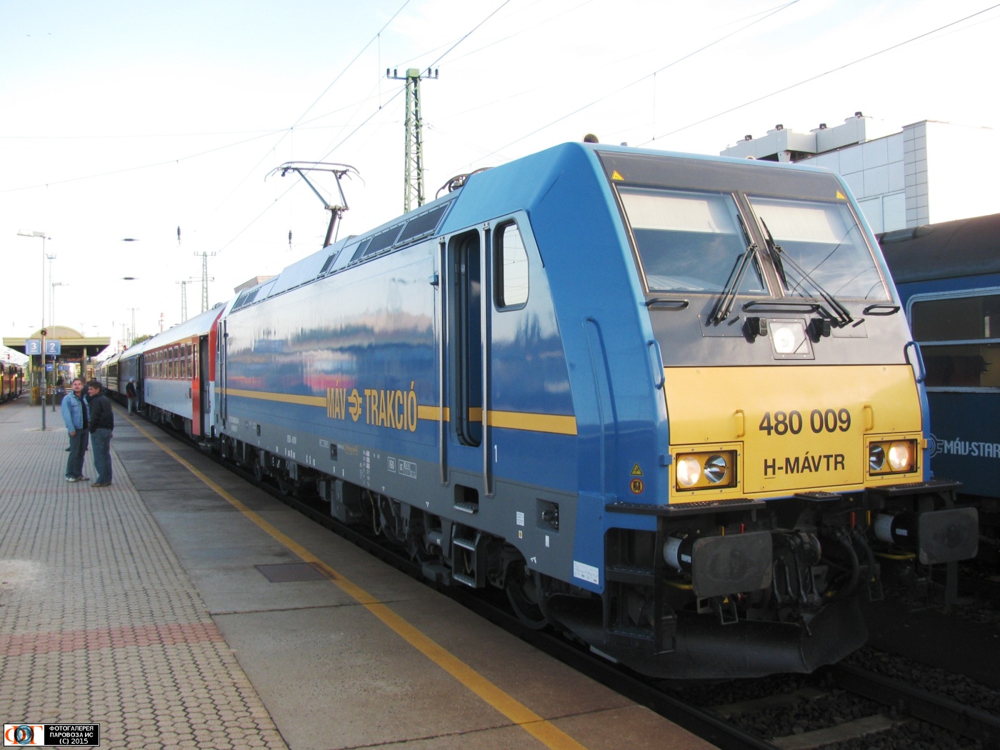 | Электровоз 480-009 с поездом № 15 "Тиса" на станции Ньиредьхаза (Nyíregyháza), Венгрия Автор: Самофалов Олег | Фото сделано 21.IX.2012, опубликовано 12.II.2016.