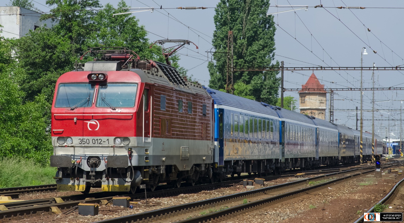 | Электровоз 350.012-1 с пассажирским поездом EC273 "Чардаш" Прага - Будапешт отходит от станции Нове-Замкы, Словакия Автор: ES499 | Фото сделано 27.V.2016, опубликовано 19.VI.2016.