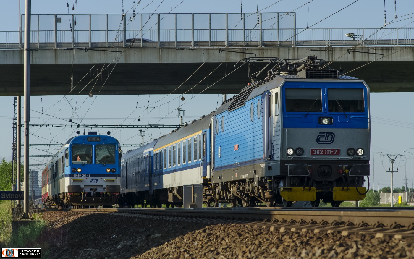| Электровоз 362.111-7 с пассажирским поездом R834 и вагон с кабиной управления 80-29.004-6 с пассажирским поездом Os2883 на перегоне Острава-Свинов - Полaнка, Чехия Автор: ES499 | Фото сделано 8.VI.2016, опубликовано 23.VIII.2016.
