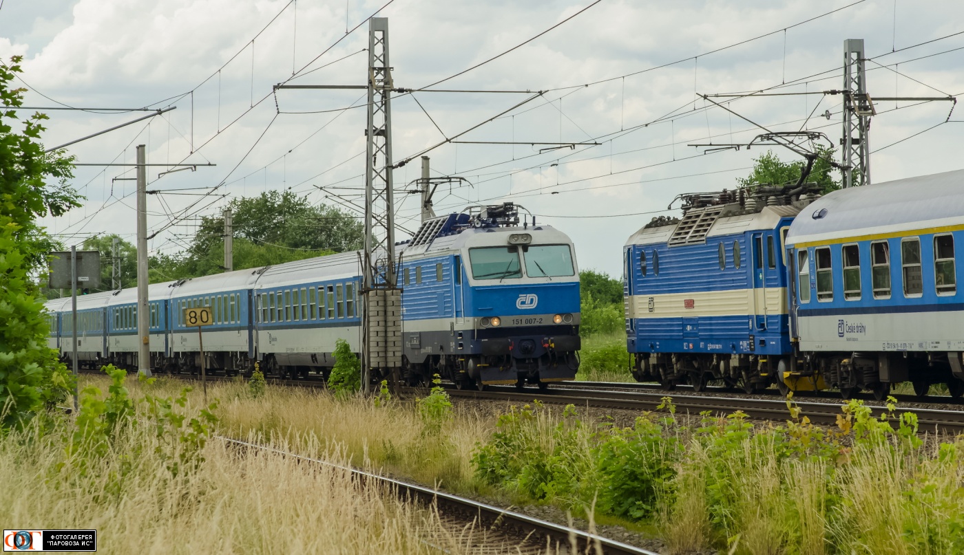 | Электровоз 151.007-2 с пассажирским поездом Ex149 и электровоз 362.171-1 с пассажирским поездом R836 на перегоне Драготуше - Границе-на-Мораве, Чехия Автор: ES499 | Фото сделано 19.VI.2016, опубликовано 14.IX.2016.
