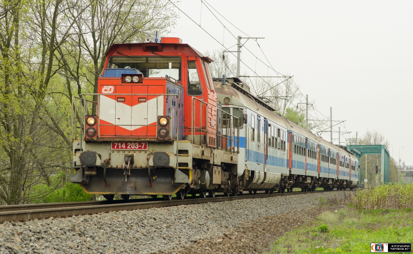 | Тепловоз 714.203-7 тянет электропоезд 460.064-9 на перегоне Острава-Главный вокзал - Острава-Свинов, Чехия Автор: ES499 | Фото сделано 23.IV.2016, опубликовано 4.VI.2017.