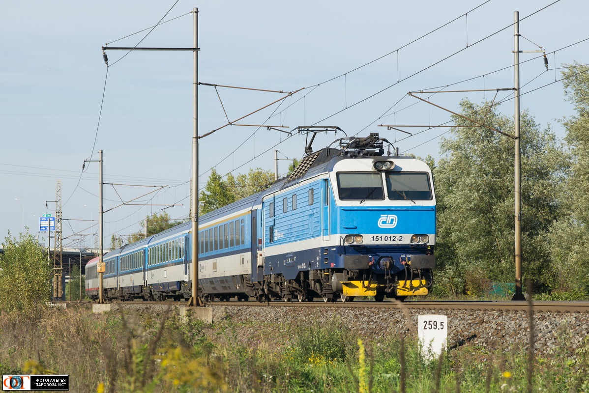 | Электровоз 151.012-2 с пассажирским поездом Ex140 на перегоне Острава-Свинов - Полaнка, Чехия Автор: ES499 | Фото сделано 18.IX.2018, опубликовано 4.X.2018.