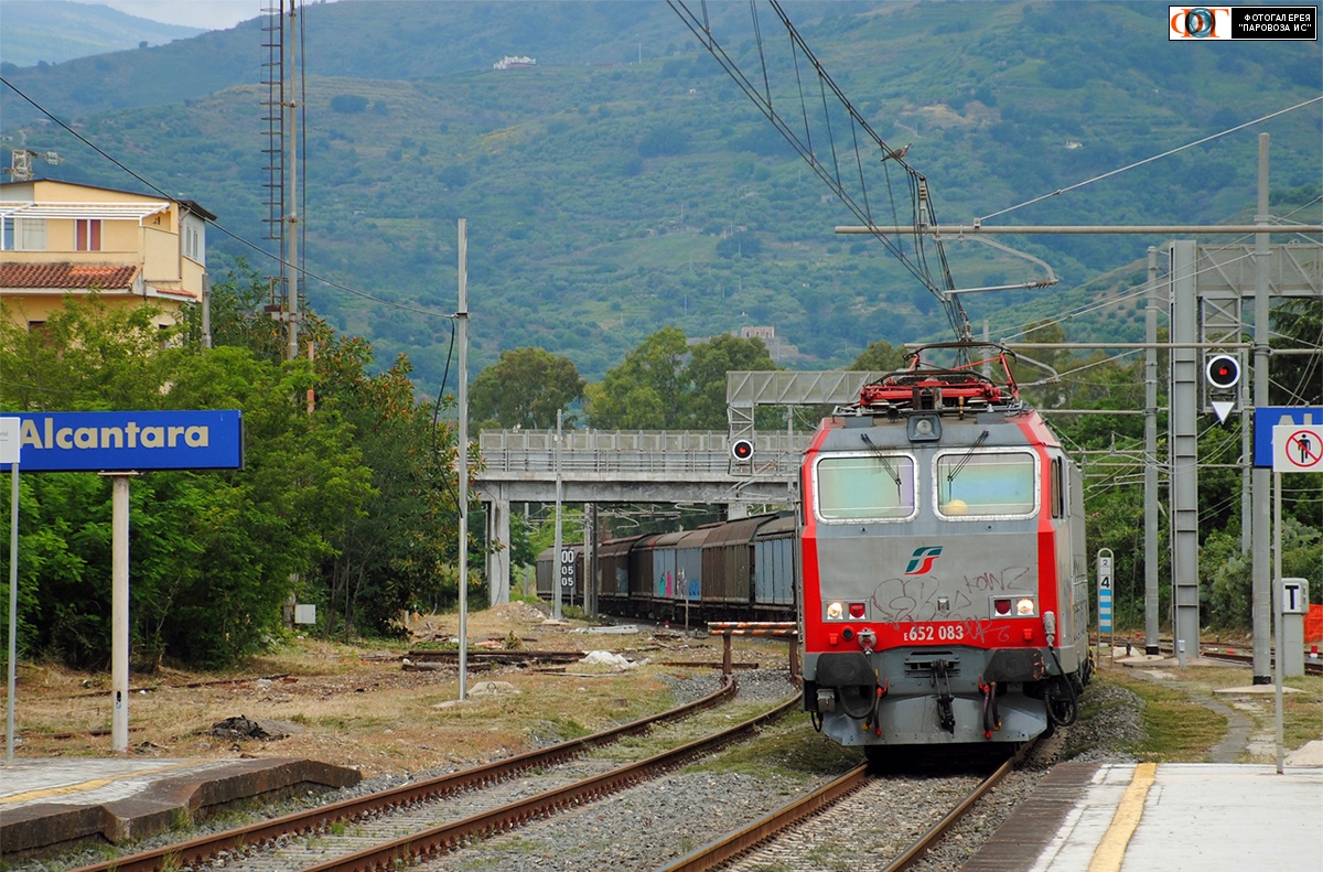 | Электровоз Е652 083 с грузовым поездом, Сицилия, станция Алькантара, Италия Автор: trainagain | Фото сделано 2.VI.2019, опубликовано 5.IX.2019.