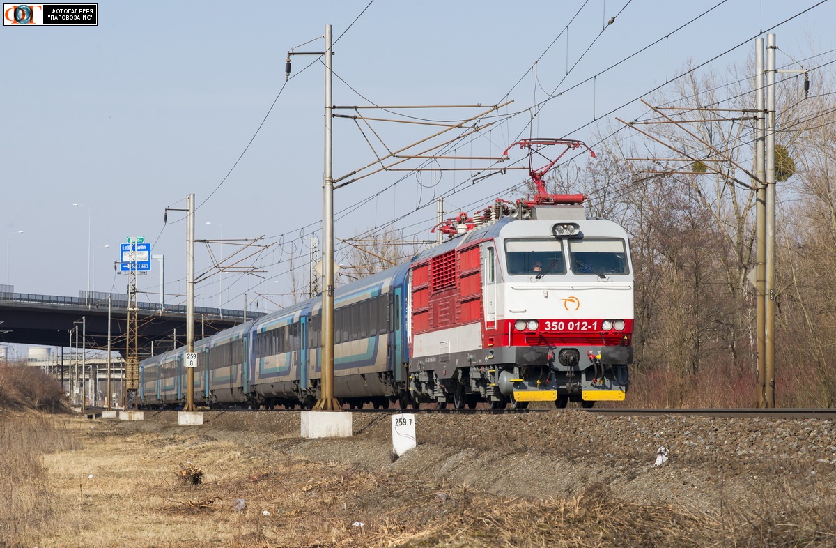 | Электровоз 350.012-1 с пассажирским поездом EC131 на перегоне Острава-Свинов - Полaнка, Чехия Автор: ES499 | Фото сделано 20.III.2022, опубликовано 23.III.2022.