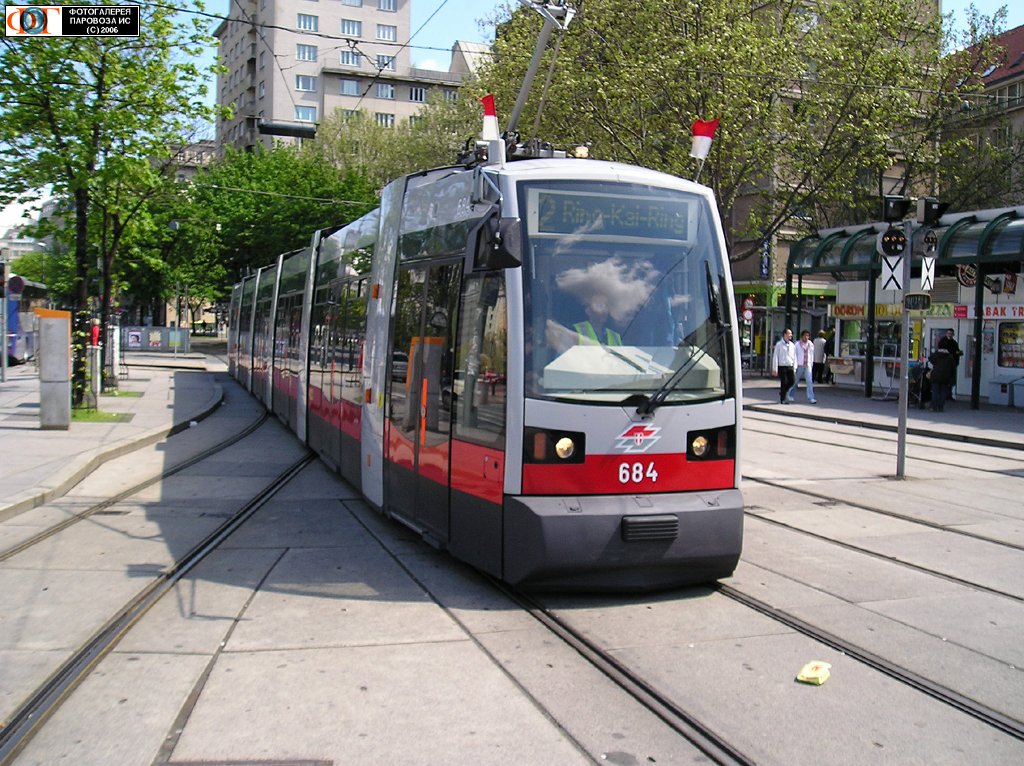 | Трамвай нового типа № 684 маршрута 2, Вена, Австрия Автор: Олег C. | Фото сделано 1.V.2006, опубликовано 17.IX.2006.