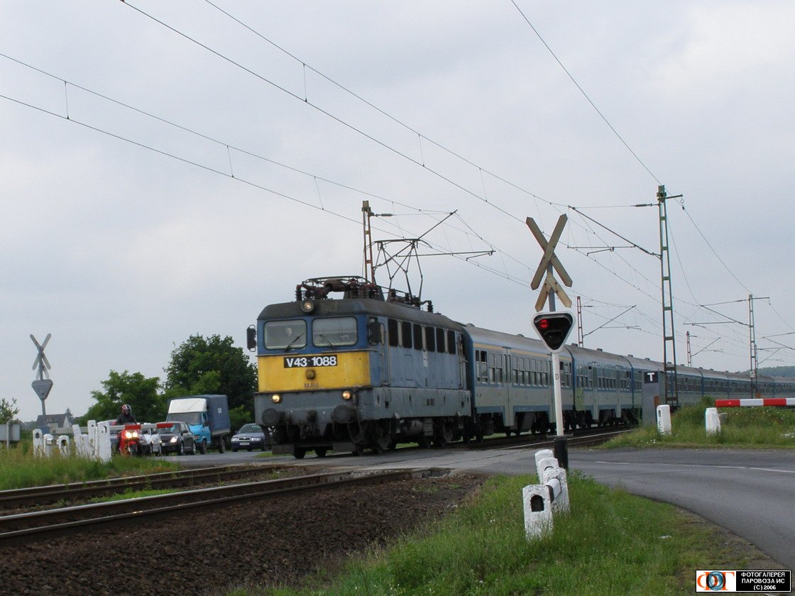 | Электровоз V43-1088 с пассажирским поездом подходит к станции Кишварда, Венгрия Автор: Helgi | Фото сделано 22.VI.2007, опубликовано 10.VII.2007.