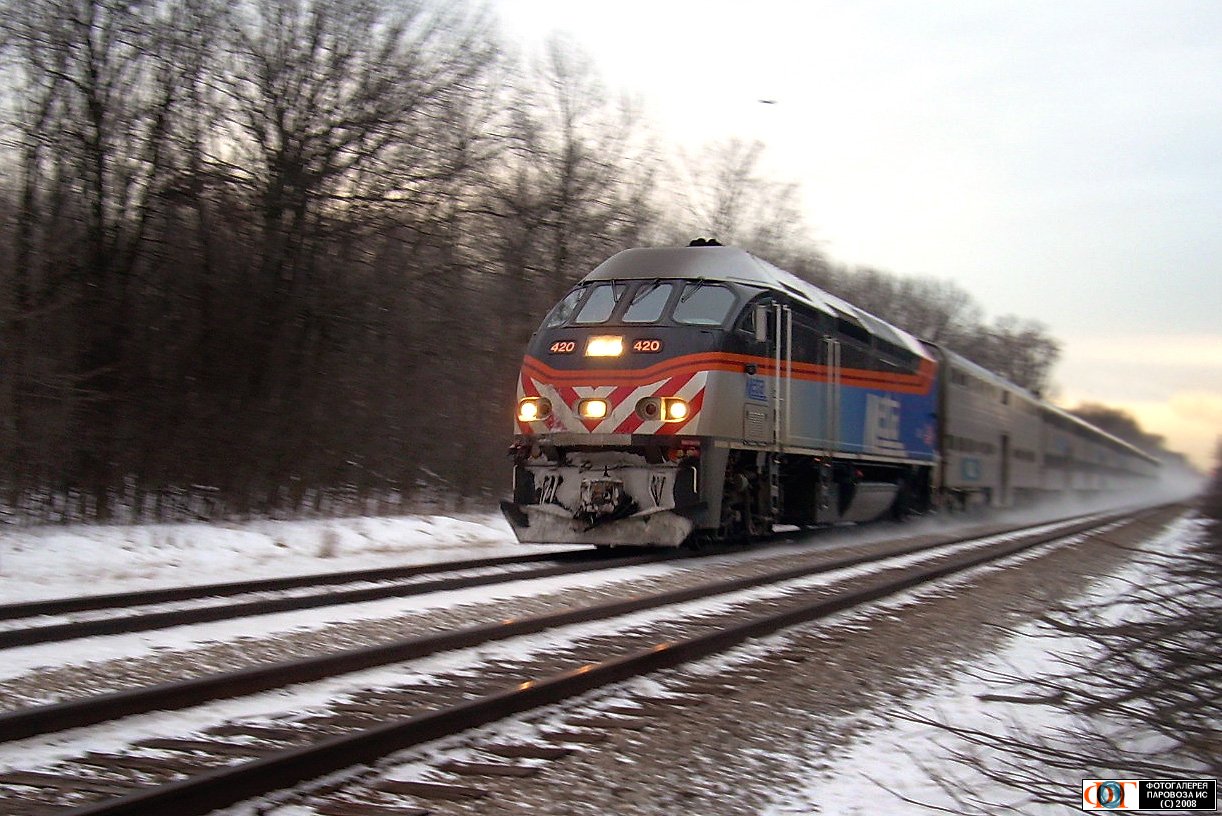 | С ветерком. Поезд компании "Метра" с тепловозом MP36PH-3S-420 на участке Форест-Глен - Эджбрук. Линия Чикаго - Фокс-Лейк, Чикаго, США/Иллинойс Автор: Роман | Фото сделано 25.I.2008, опубликовано 30.I.2008.