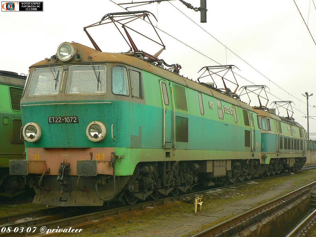 | Электровозы ET22-1072 и ET22-596 выезжают под поезд из депо Щецинек, Польша Автор: Zb. Antonowicz- privateer | Фото сделано 7.III.2008, опубликовано 13.III.2008.