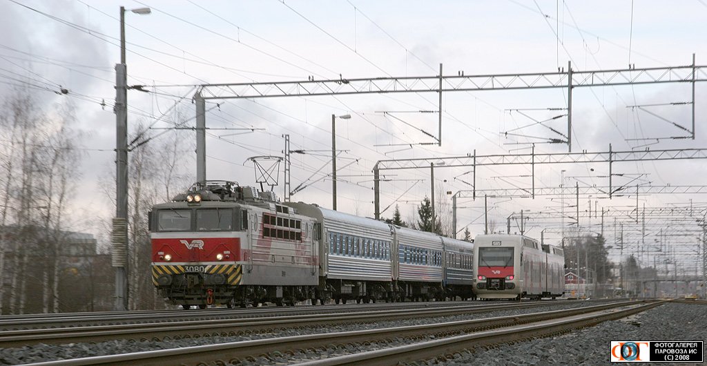 | Электровоз Sr1-3080 с поездом "Репин" разминулся с электричкой Sm4 в районе Керава, Финляндия Автор: Станислав Воронин | Фото сделано 14.III.2008, опубликовано 17.III.2008.