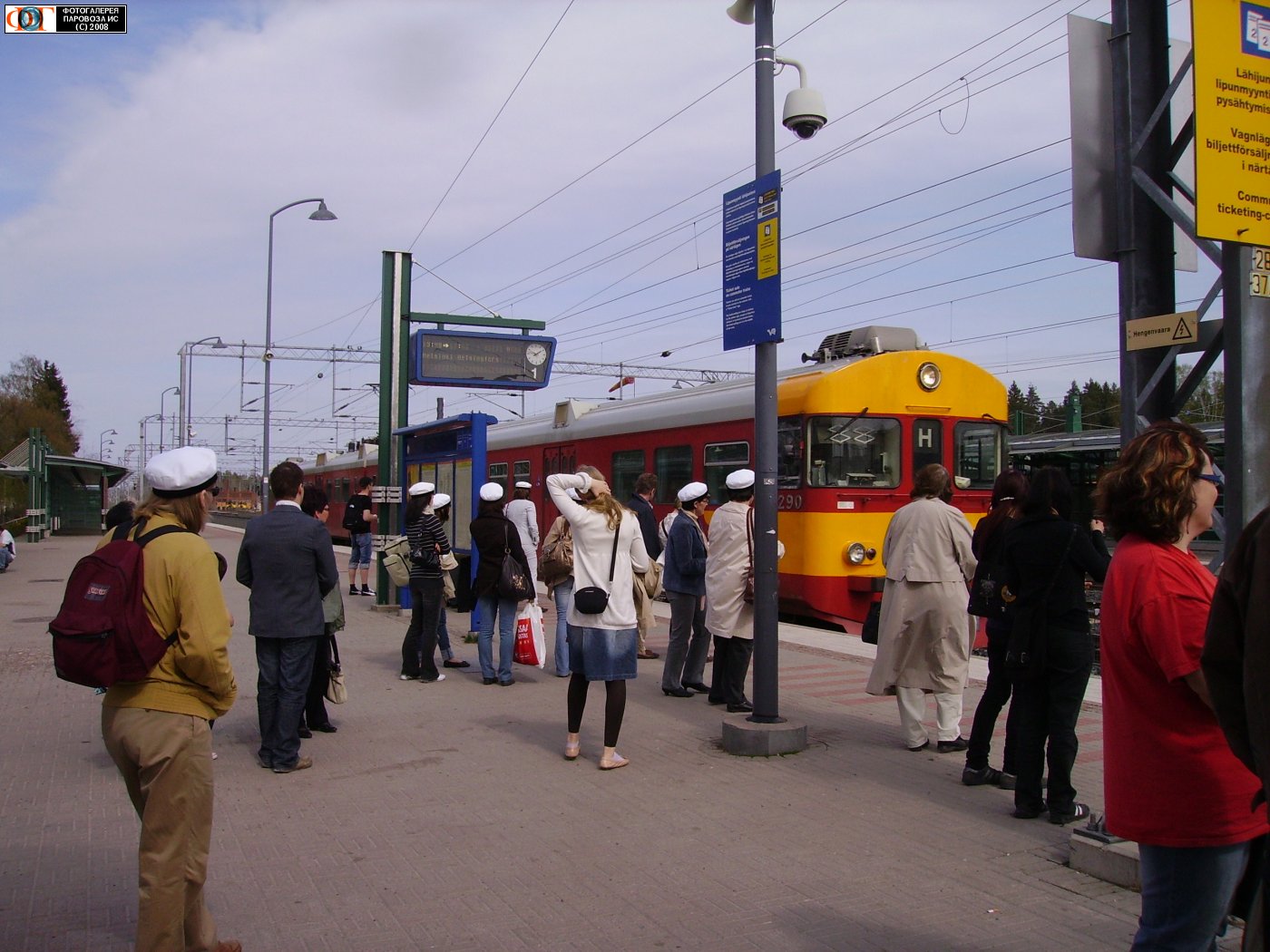 | Прибытие электропоезда Sm2 на ст. Керава. Первое Мая, Ваппу. У студентов и выпускников школ на головах традиционные белые фуражки. Уусимаа, Финляндия Автор: Шитов Дмитрий | Фото сделано 1.V.2008, опубликовано 2.V.2008.