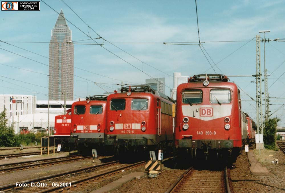 | Тепловоз 212.051 и электровозы 150.061, 140.173, 140.393 в депо Франкфурт-на-Майне II, Германия/Гессен Автор: Dirk Otte | Фото сделано V.2001, опубликовано 25.V.2008.