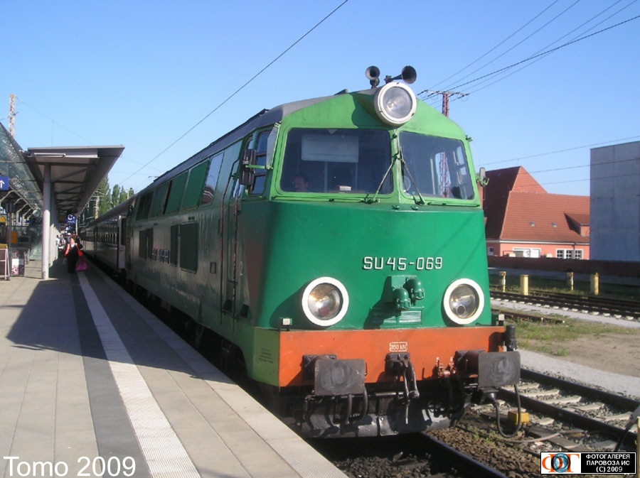| Тепловоз SU45-069 PKP с пассажирским поездом ожидает отправления в Збоншинек (Zbąszynek), станция Франкфурт-на-Одере, Германия/Бранденбург Автор: Tomasz Sijka | Фото сделано 2.V.2009, опубликовано 6.VI.2009.