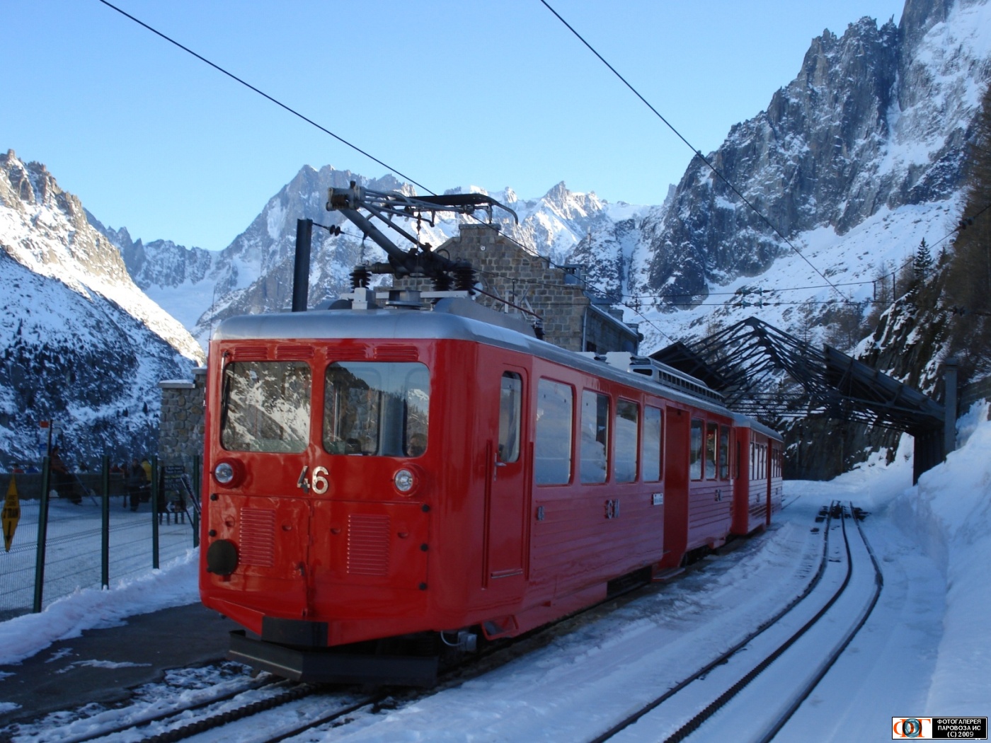| Поезд зубчатой железной дороги в Шамони́-Монбла́н, Франция Автор: Самофалов Олег | Фото сделано 28.I.2007, опубликовано 8.IX.2009.