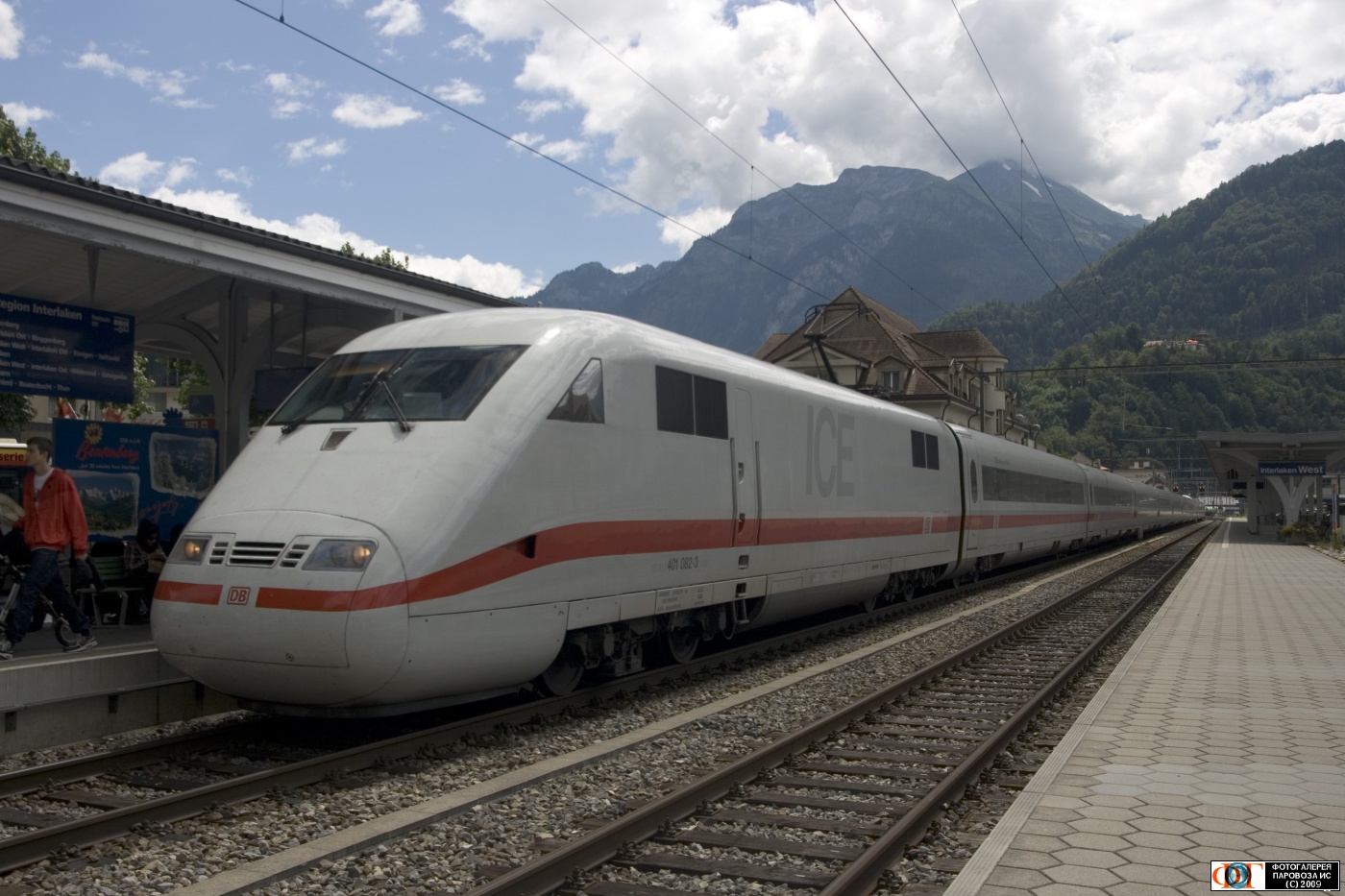 | Поезд ICE на станции Интерлакен-Вест, Швейцария Автор: Максим Козленко | Фото сделано 22.VII.2008, опубликовано 17.IX.2009.