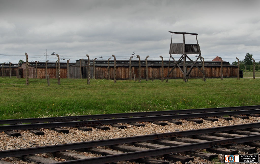 Деревянные бараки на фоне подъездных путей второго концлагеря Освенцима (Aushwitz II Birkenau), Бжезинка (пригород Освенцима)