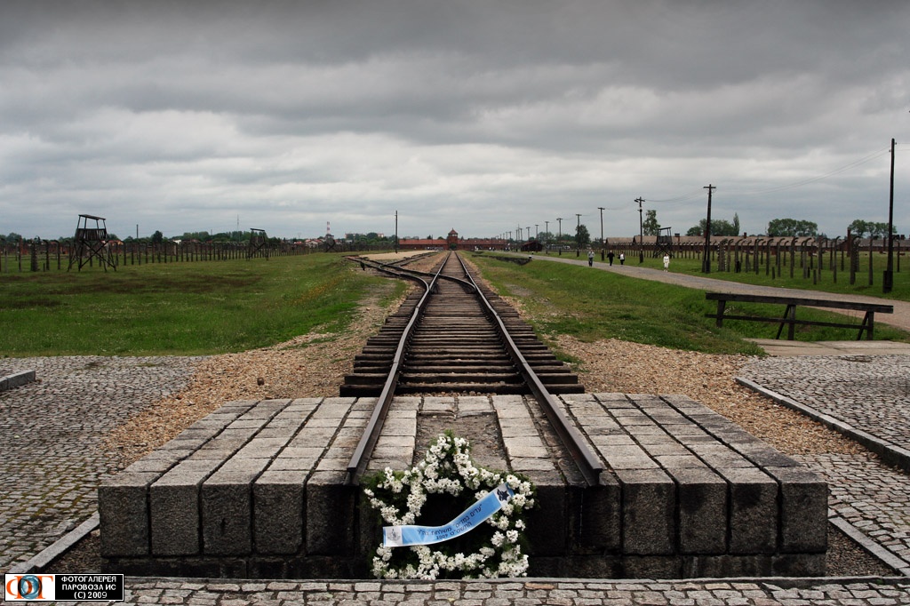- За спиной фотографа - аскетичный мемориал. Справа за кадром - руины взорванных немцами крематориев. В стороны до самой линии горизонта - одноэтажные кирпичные и деревянные бараки в отдельных зонах, которые были огорожены колючей проволокой под напряжением. К железной дороге это уже отношения не имеет. А перед нами - разгрузочные пути лагеря Аушвиц II, куда прибывали эшелоны с узниками. У людей отбирали багаж и бегло осматривали на годность к работам. Слабых, престарелых и больных - а таких было 3/4 заключенных - отправляли в газовые камеры сразу. Остальные проходили "дезинфекцию", остригались наголо, с них сдергивали последние драгоценности и распределяли по специально отведенным баракам - для работы на близлежащих заводах и фабриках, на медицинские опыты Йозефа Менгеля, а женщин - еще и в качестве личных рабов для нацистских офицеров. -- Wowan