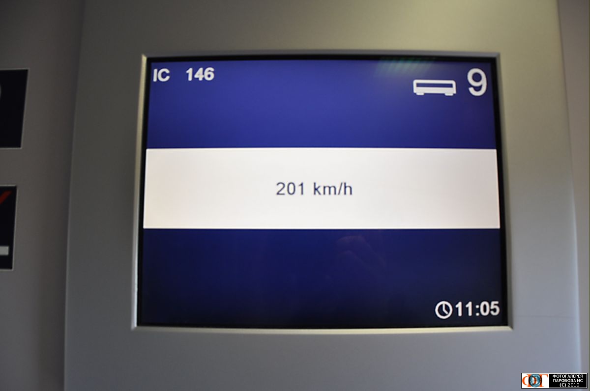 | Показания скоростемера на информационном табло в вагоне 2 класса поезда IC 146, Германия Автор: Александр ТЧ-15 | Фото сделано 20.X.2010, опубликовано 16.XI.2010.
