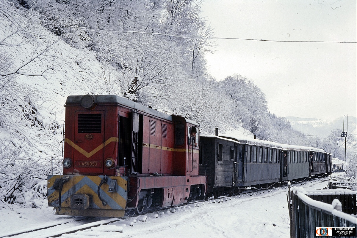 | Тепловоз L45H-053 с пассажирским поездом отправляется с ст. Вишеу-де-Сус (Vişeu de Sus) с пассажирским поездом в Коман (Coman), Румыния Автор: Martin Haefliger | Фото сделано IV.1992, опубликовано 15.II.2011.