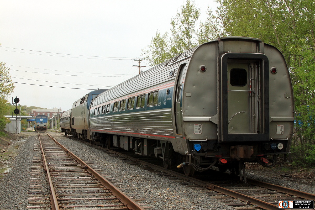 | Тепловозы P42DC "Дженезис" №№ 122 (справа, вцепенный между двумя пассажирскими вагонами) и 133 (слева) компании "Амтрак", ст. Портленд, США/Мэн Автор: Зиновьев Д. | Фото сделано 22.V.2011, опубликовано 24.V.2011.