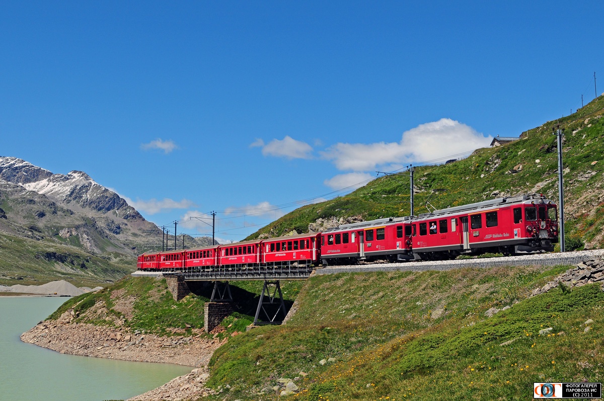 | Электромотрисы АBe 4/4 43 и 47 недалеко от ст. Оспицио-Бернина (Ospizio Bernina), Швейцария Автор: Martin Haefliger | Фото сделано 7.VIII.2010, опубликовано 7.X.2011.