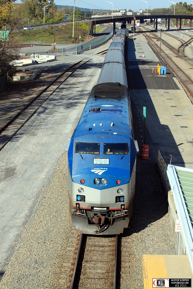 | Поезд компании "Амтрак" с тепловозом P32AC-DM-708 вползает на ст. Олбани-Ренселер (вертикальный кадр), США/Нью-Йорк Автор: Зиновьев Д. | Фото сделано 9.X.2011, опубликовано 17.X.2011.