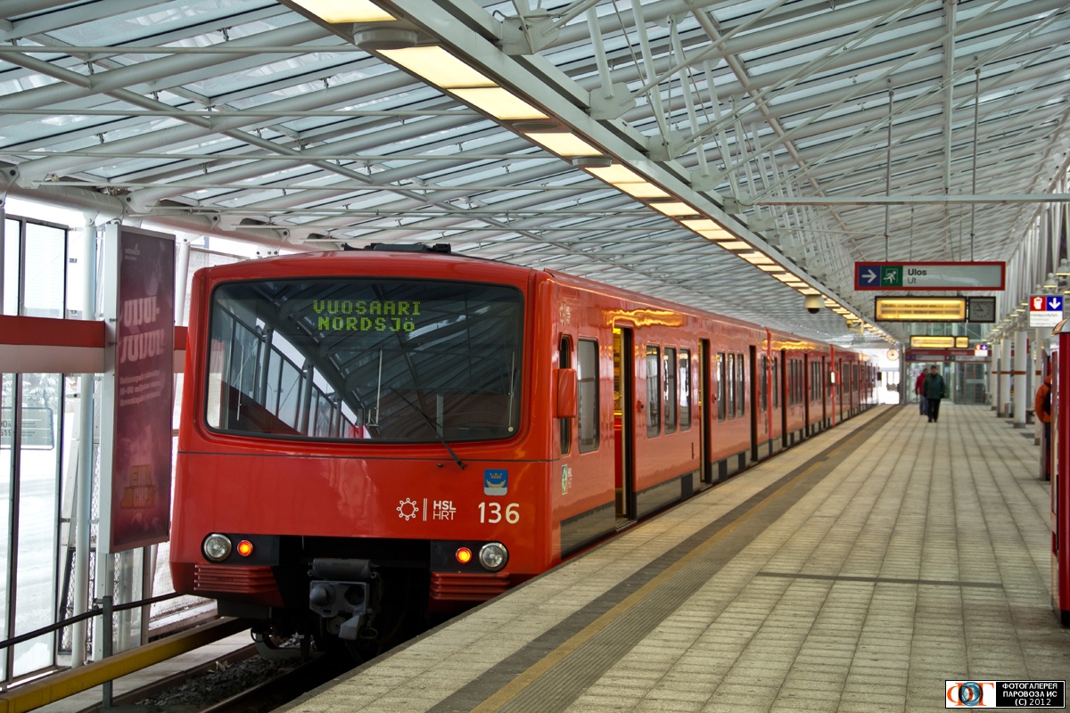 | Метропоезд M100 с головным вагоном №136, стация "Вуосаари" ("Vuosaari"), г. Хельсинки , Финляндия Автор: Григорий Егоров † | Фото сделано 25.III.2012, опубликовано 29.III.2012.