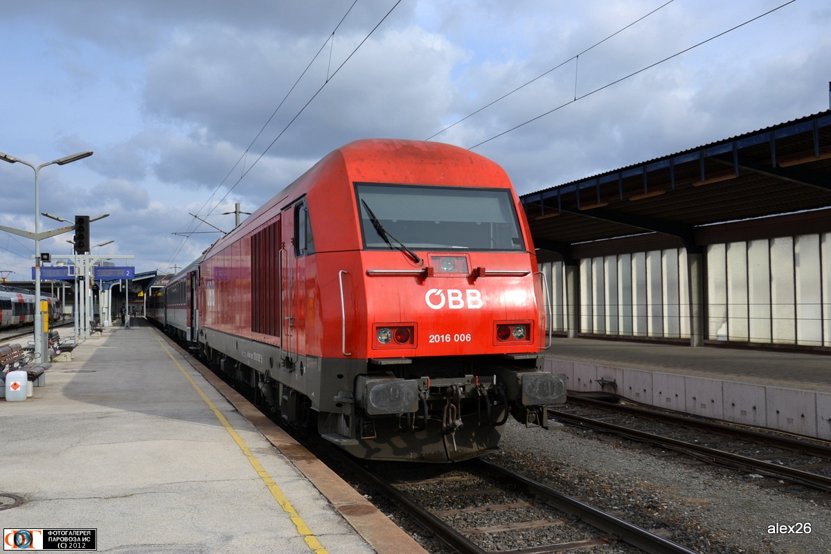 | Тепловоз 2016-006 Австрийских ж.д. с поездом Вена - Братислава на Южном вокзале Вены, Австрия Автор: Алекс | Фото сделано 8.IV.2012, опубликовано 8.V.2012.