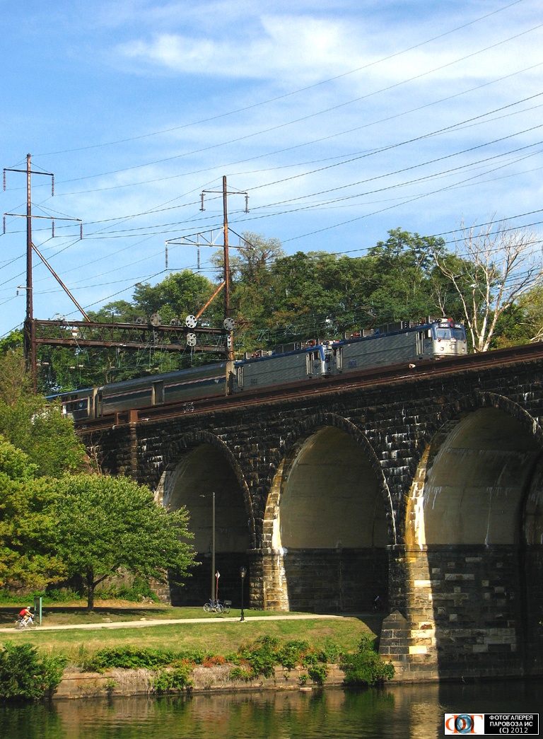 | Электровозы компании "Амтрак" АЕМ7-904 и АЕМ7-944 проходят мост через р. Скулкил с поездом №19 "Полумесяц" Нью-Йорк - Новый Орлеан, США/Пенсильвания Автор: Женя | Фото сделано 19.IX.2010, опубликовано 18.VII.2012.