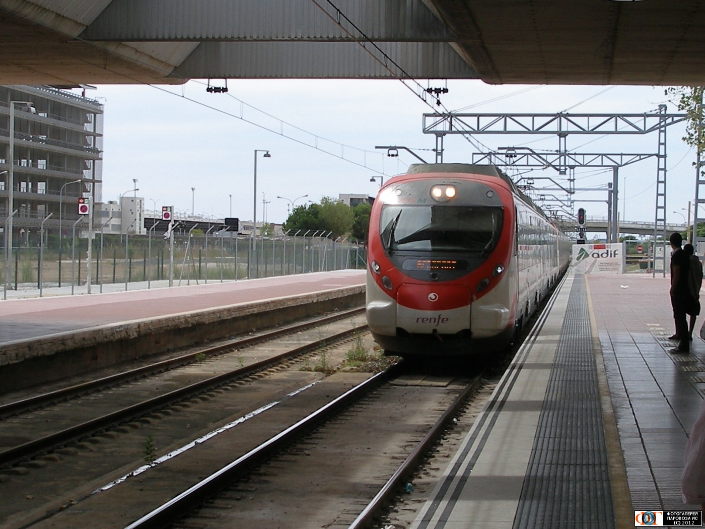 | Пригородный поезд компании Renfe прибывает на ст. Аэропорт. Барселона, Испания Автор: Алексей Жучков | Фото сделано 1.IX.2012, опубликовано 21.IX.2012.