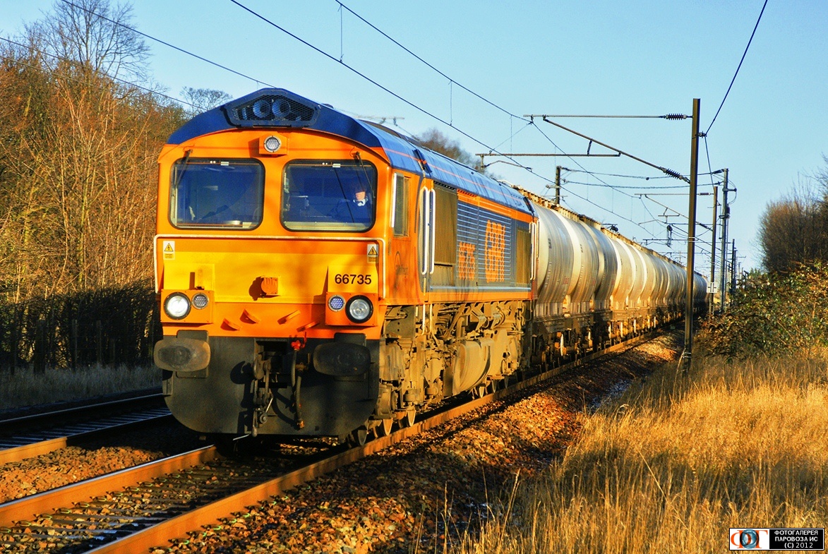 | Грузовой поезд с тепловозом 66-735 на линии Эдинбург - Ньюкасл (Edinburgh - Newcastle), Шотландия, Великобритания Автор: Euster | Фото сделано 1.XII.2012, опубликовано 11.XII.2012.